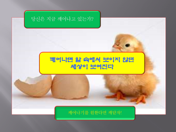 '줄탁동시(茁琢同時)'라는 말이 있지요. 이는 병아리가 알 속에서 부리로 알을 깨뜨리려고 열심히 알을 쪼아서 스스로 깨어 나오는 것이고, 이때 도저히 제 힘으로 안되면 어미가 큰 부리로 톡 하고 깨어 주는 의미입니다. 알에서 깨어나면 새로운 세상이 보입니다. 나 혼자 안되면 성현들의 말씀을 통해서 깨어나야 하는 법!